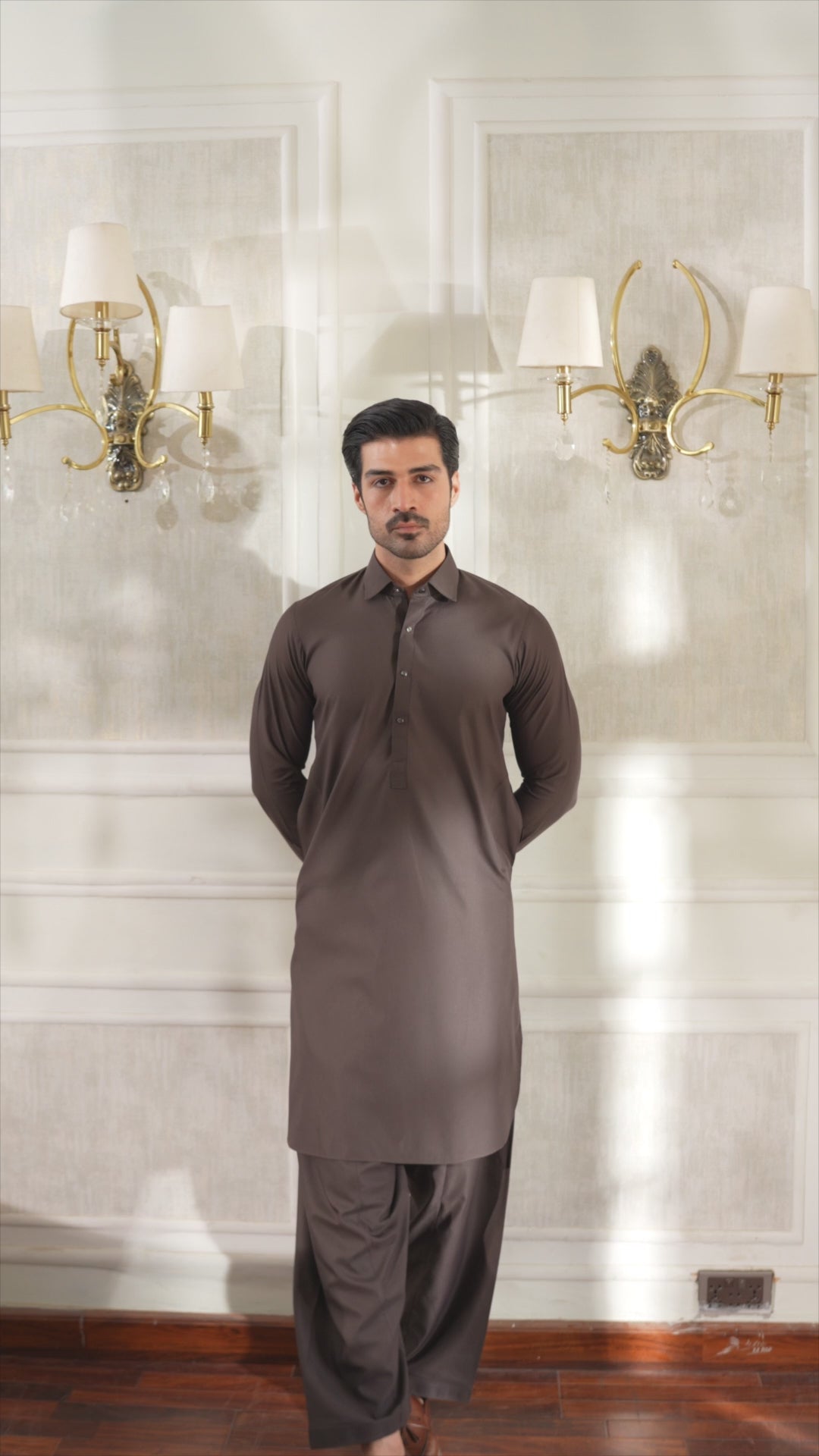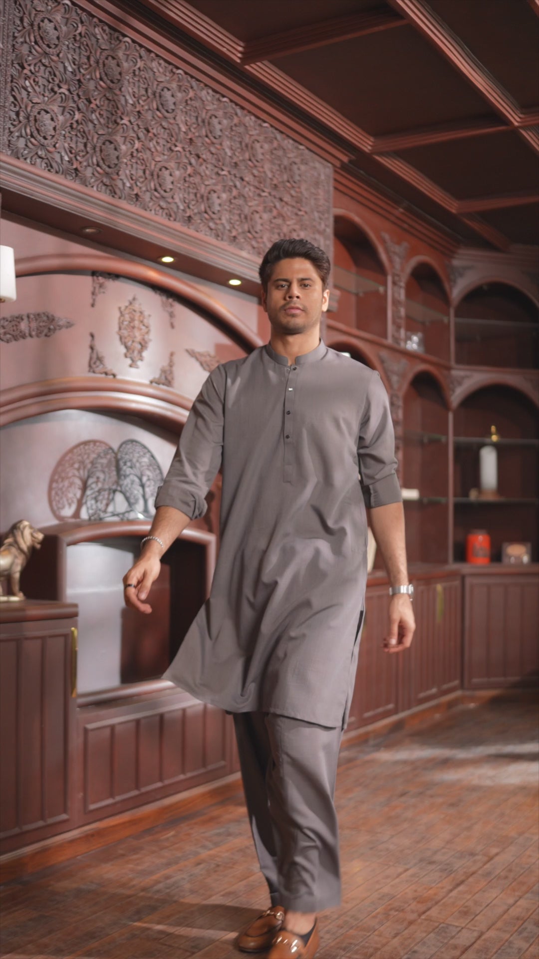 Crafted from premium blended fabric with a slub texture, featuring a refined round collar, snap button placket, and tailored cuff sleeves for a sophisticated and modern look. SPECIFICATION: Fabric: Premium BlendedColor: Grey Fit: RegularCollar: Band CollarBottom: ShalwarCARE: Machine Wash I Tumble Dry I Do Not...